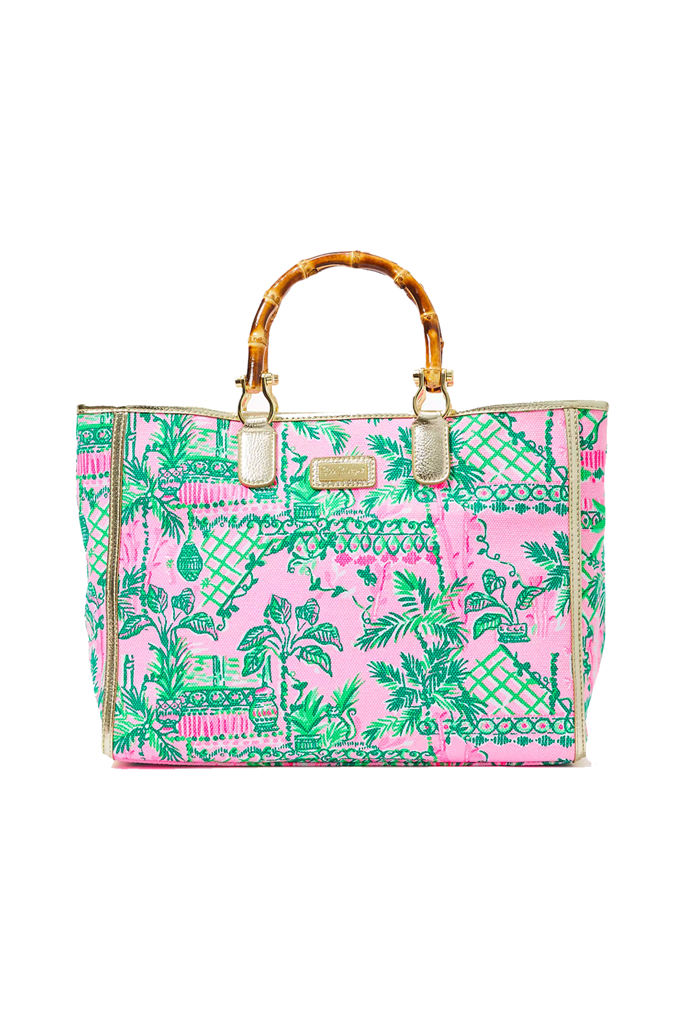 Our Greydon Canvas Tote stands out this season with its captivating print, making it a fashionable accessory. Featuring ample space for all your belongings, this tote is adorned with top handles made from natural bamboo, adding a tropical flair.