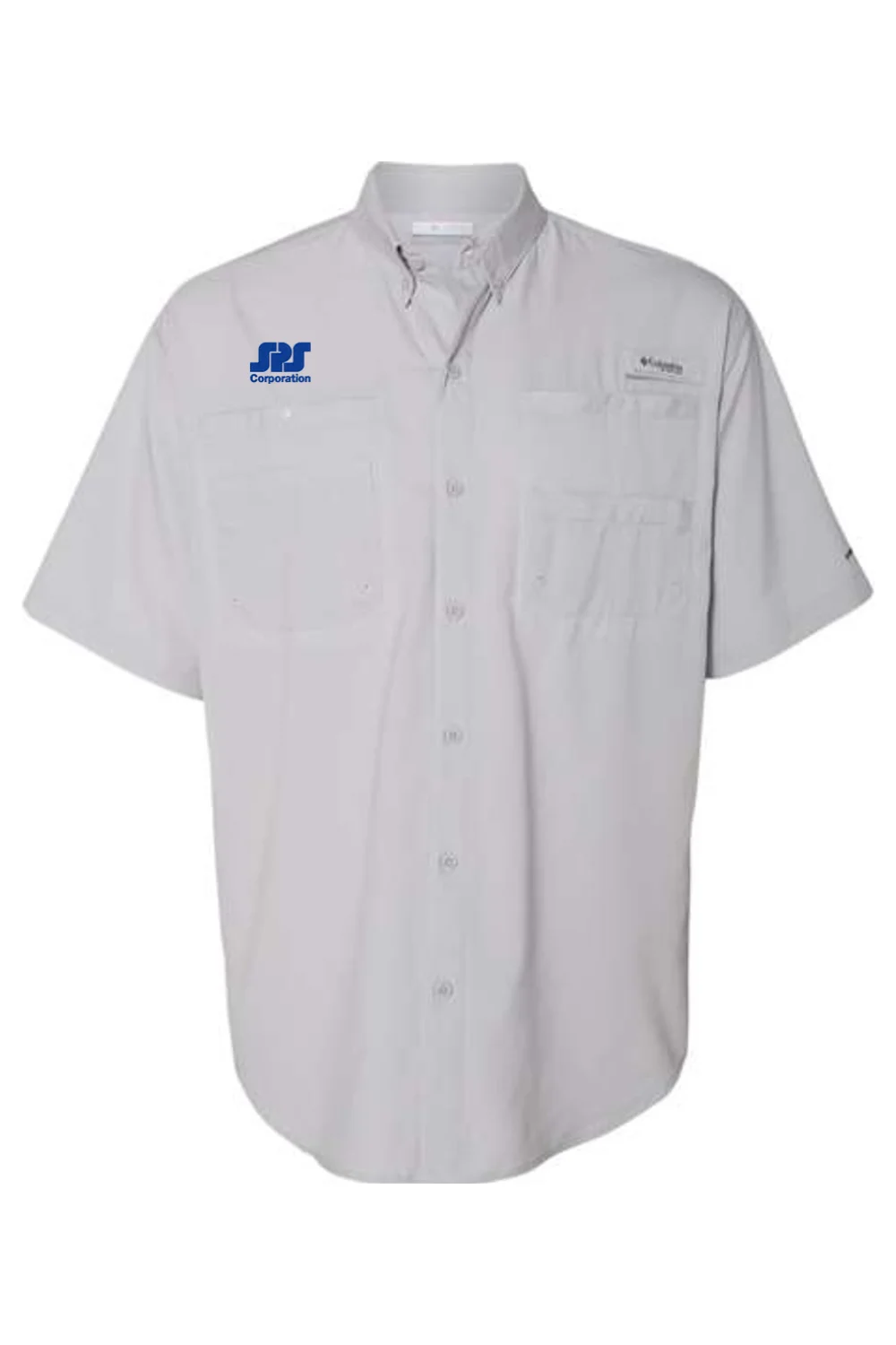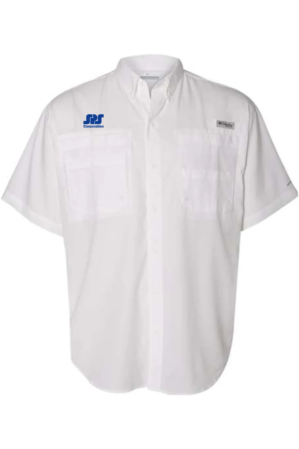 The men’s Columbia short sleeve shirt is crafted from 2.4 oz./yd² 100% polyester ripstop, featuring Omni-Wick™ moisture management, Omni-Shade™ UPF 40 protection, a mesh-lined back vent, chest pockets with snap closures, and a hook-and-loop rod holder with the Columbia patch logo on the left chest.