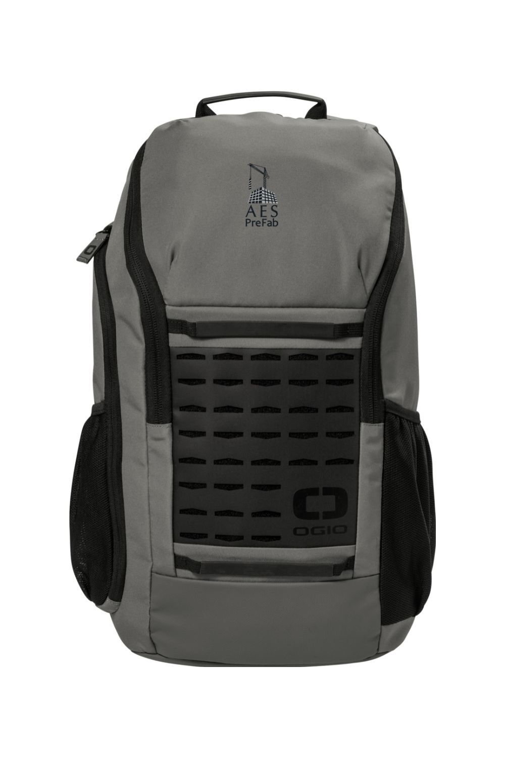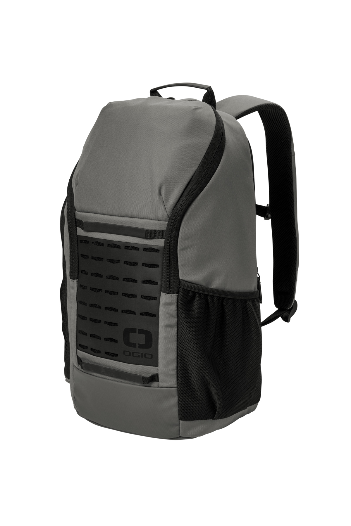 The OGIO Surplus Pack, made from 500D poly, features a laser-cut front panel for attaching small items, a spacious main compartment, padded laptop/tablet sleeve, fleece-lined valuables pocket, ergonomic shoulder straps, side pockets, and a luggage trolley pass-through, all in a 19.2″ x 10.9″ design with a 22L capacity.