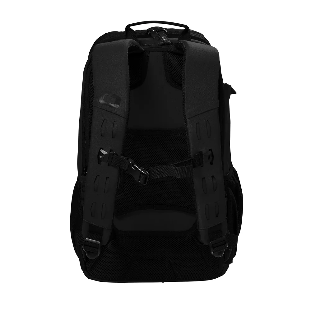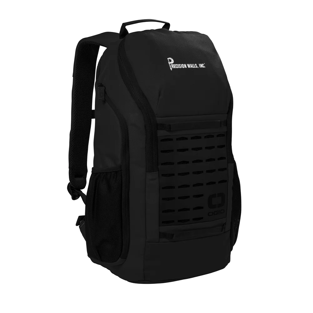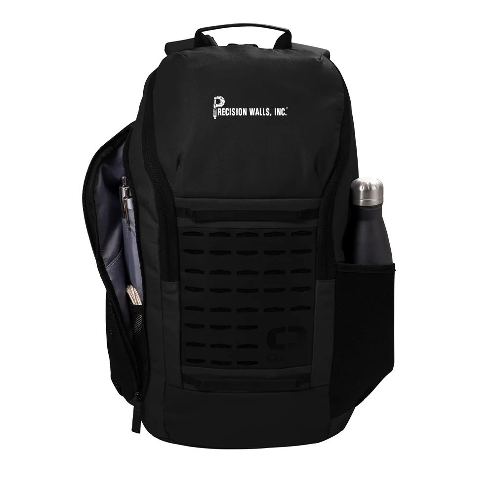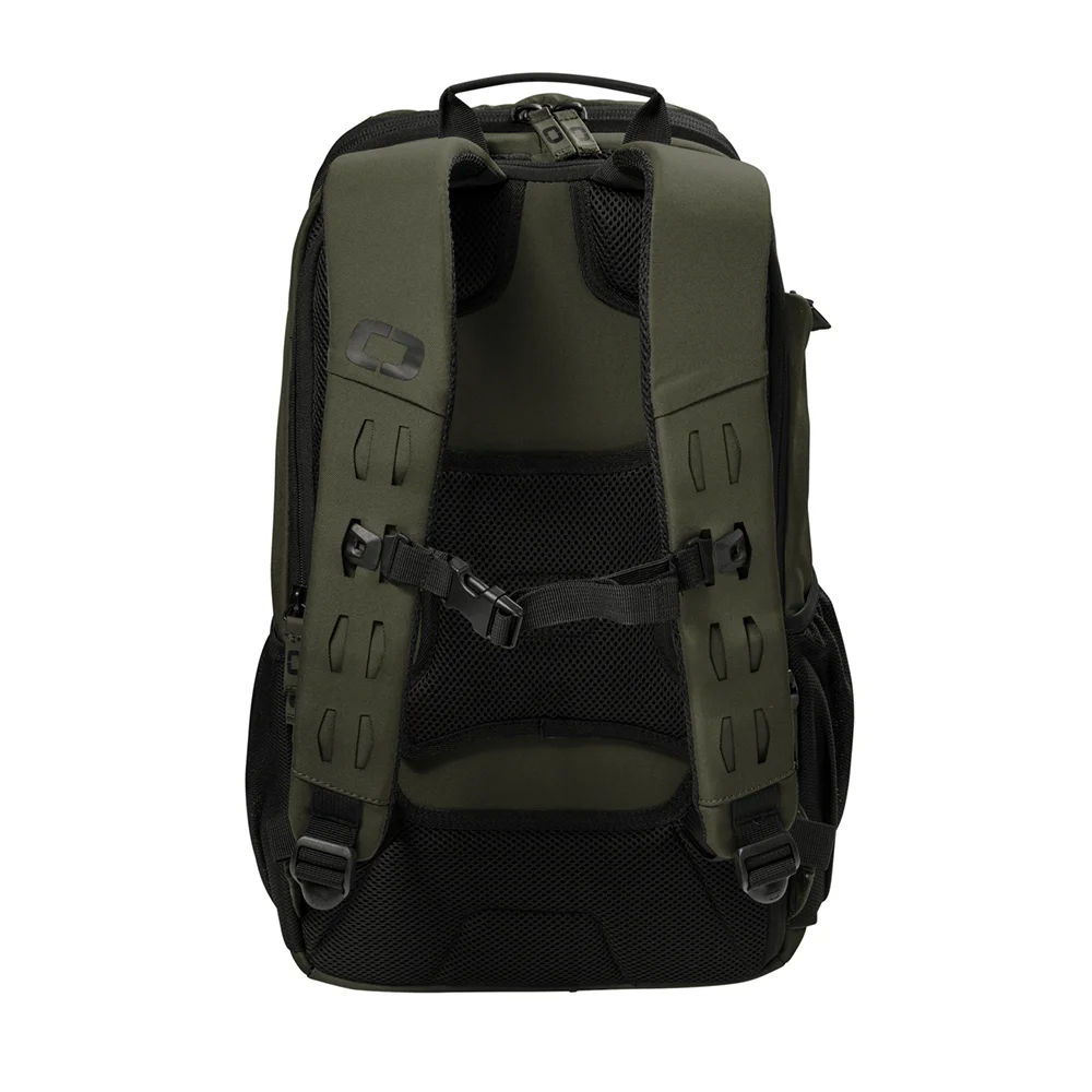The OGIO Surplus Pack, made from 500D poly, features a laser-cut front panel for attaching small items, a spacious main compartment, padded laptop/tablet sleeve, fleece-lined valuables pocket, ergonomic shoulder straps, side pockets, and a luggage trolley pass-through, all in a 19.2″ x 10.9″ design with a 22L capacity.