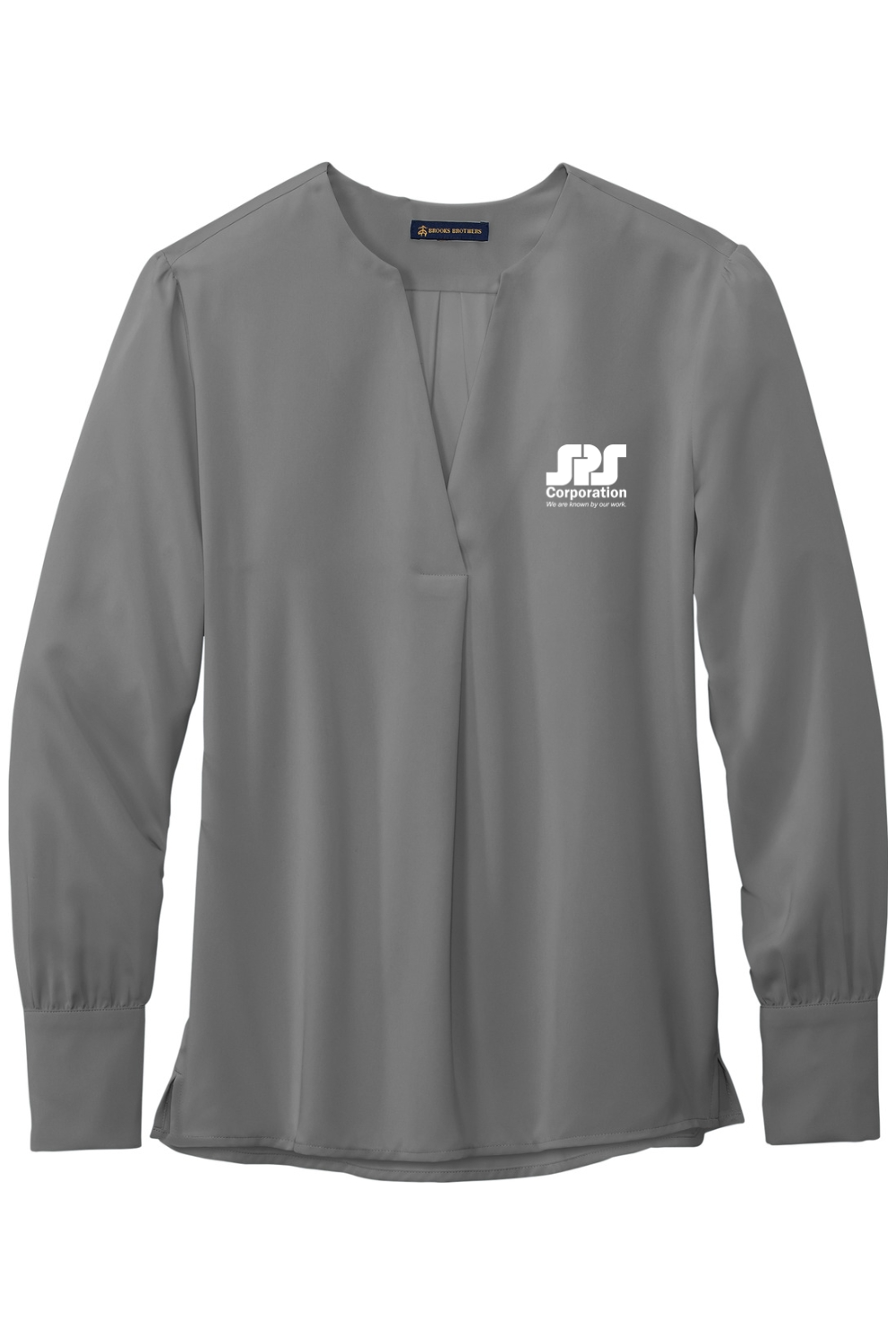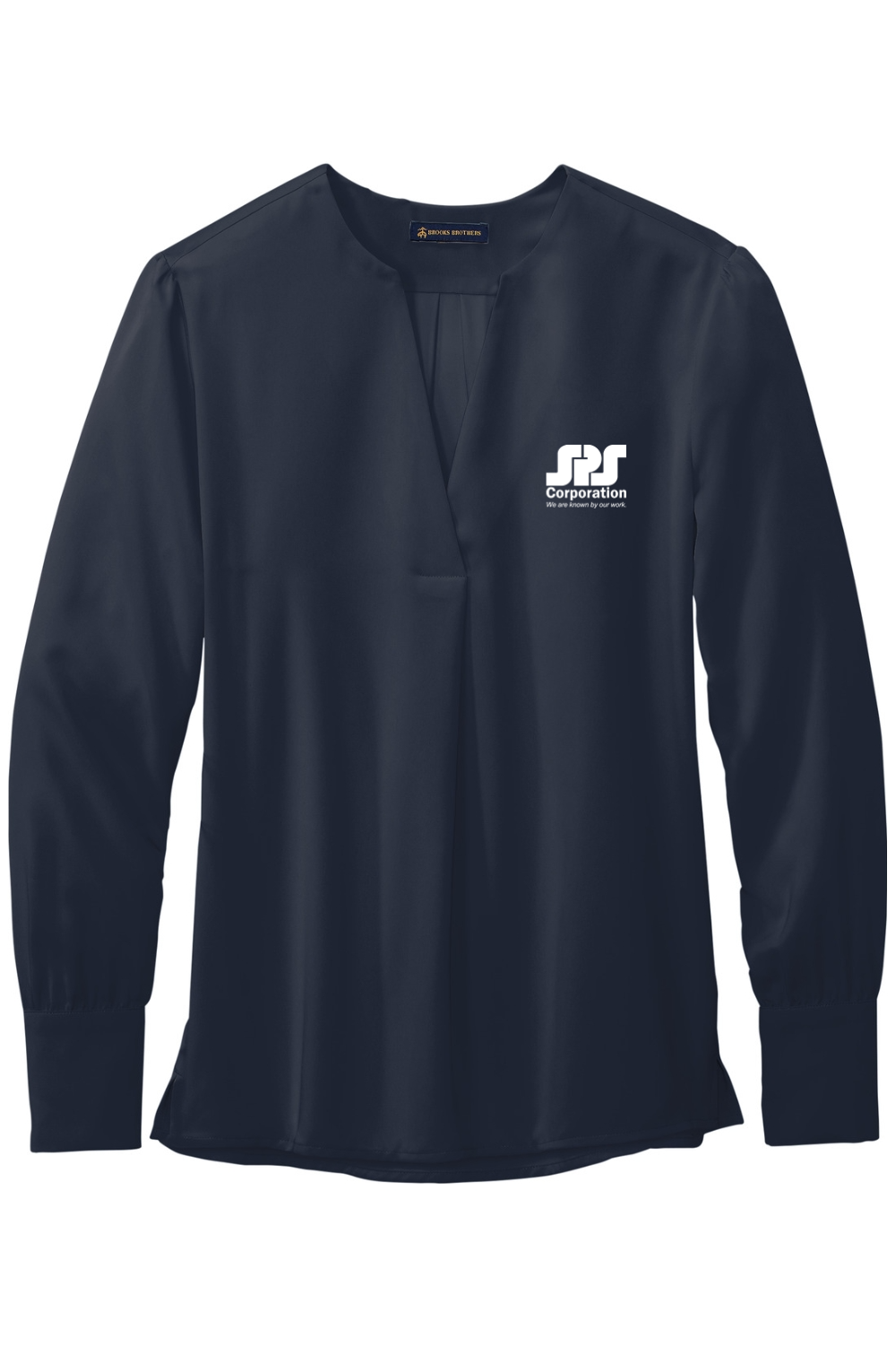 This versatile blouse is crafted from soft satin fabric with a subtle sheen for an elegant look, designed for a comfortable, easy fit. Made from 4.1-ounce 100% polyester satin with an anti-static finish, it features an open v-neck popover, a wide box pleat at the back yoke, gathers at the shoulders and cuffs, three self-fabric-covered buttons at the cuffs, and side vents for added style and movement.